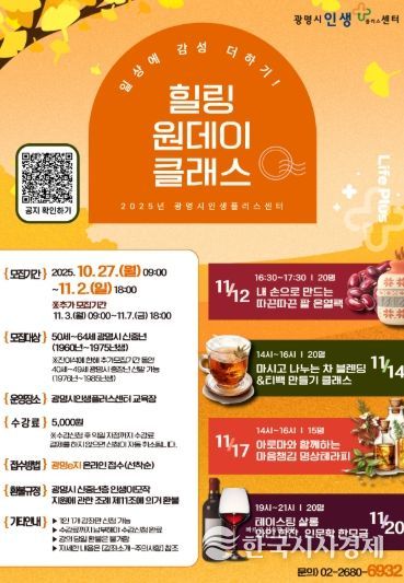 한국시사경제 경기취재본부 | 광명시 인생플러스센터가 오는 11월 12일부터 20일까지 신중년의 정서적 힐링과 문화 감수성 향상을 위한 ‘일상에 감성 더하기! : 힐링 원데이 클래스’를 운영한다.