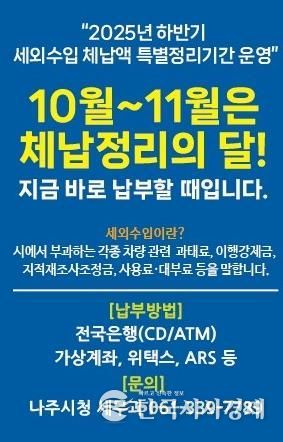 한국시사경제 권충언 기자 | 전라남도 나주시가 지방재정의 건전성 확보와 조세 정의 실현을 위해 오는 11월까지 ‘하반기 세외수입 체납액 특별정리기간’을 운영하며 체계적인 징수 활동에 나선다.
