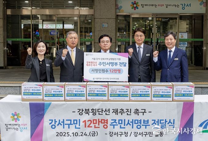 한국시사경제 기동취재팀 | 서울 강서구는 24일 강북횡단선 신속 재추진을 위한 12만 주민 서명부 전달식을 개최했다.