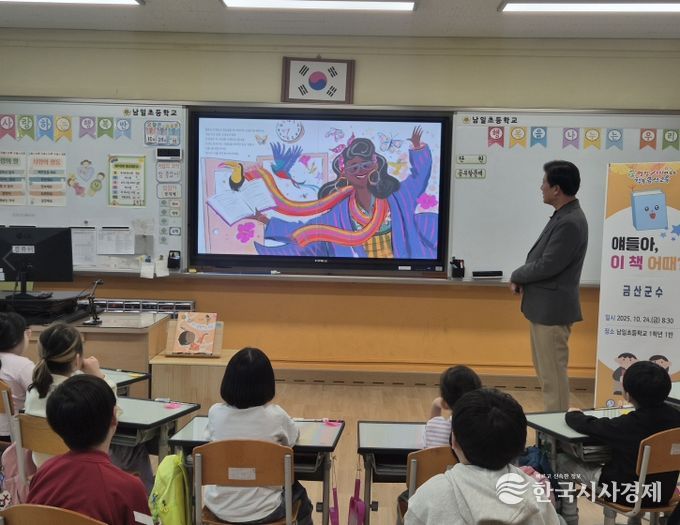 한국시사경제 김태훈 기자 | 박범인 금산군수는 지난 24일 남일초를 방문해 학생들과 함께 그림책 읽는 시간을 가졌다.