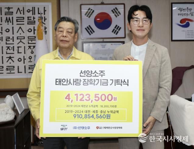 한국시사경제 충남취재본부 | 대전·충남지역의 대표 주류업체인 ㈜선양소주가 태안군에 장학금을 기탁하며 지역사랑의 마음을 전했다.