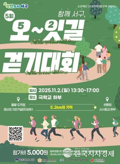 한국시사경제 광주취재본부 | 광주광역시 서구는 11월2일 극락교 하부(서창둑길 377) 일대에서 ‘제5회 함께 서구, 오~잇길 걷기대회’를 개최한다. ‘오잇길’은 ‘오(5)천원의 나눔으로 우리 이(2)웃의 희망을 잇는 5.2km의 길’이라는 의미로, 이번 대회는 가족돌봄청년을 지원하기 위해 열리는 서구 대표 주민참여형 나눔 축제다.