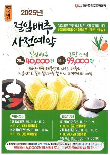 이번 행사에서는 천일염으로 절인 후 깨끗하게 세척한 태안산 절임배추 20kg을 4만 원에, 김장양념 8kg(절임배추 20kg 기준)를 9만 9천 원에 각각 판매한다.