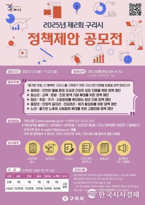 한국시사경제 경기북부취재본부 | 구리시는 오는 11월 3일부터 11월 23일까지'2025년 제2회 구리시 정책 제안 공모전'을 개최한다고 밝혔다. 이번 공모전의 주제는 ‘구리 시민(영유아·청소년·청년·중장년·노년) 나이별 맞춤형 정책 아이디어’다.