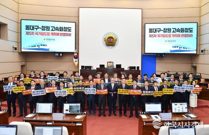 한국시사경제 오영주 기자 | 경상남도의회는 4일 본회의 종료 직후 본회의장에서 ‘동대구~창원 고속화철도 제5차 국가철도망 계획 반영 촉구 성명서’를 발표하며, 국가 균형발전의 실질적 이행을 위해 정부가 제5차 국가철도망 계획에 동대구~창원 고속화철도를 반드시 반영할 것을 강력히 촉구했다.
