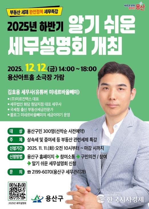 한국시사경제 노승선 기자 | 서울 용산구가 오는 11일 오전 10시부터 ‘2025 하반기 알기 쉬운 세무설명회’에 참석할 구민 300명을 선착순 사전 모집한다. 이번 설명회는 12월 12일 오후 2~6시 용산아트홀(녹사평대로 150) 소극장 가람에서 열린다.