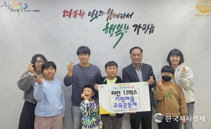 한국시사경제 경기북부취재본부 | 가평군 가평마을교육공동체는 최근 가평읍 행정복지센터를 방문해 이웃돕기 성품으로 라면 15박스를 전달했다. 이번 성품은 ‘가마공 벼룩시장’에서 아이들이 팀을 이루어 직접 물건을 준비하고 판매에 참여해 얻은 수익금으로 준비한 것이다.