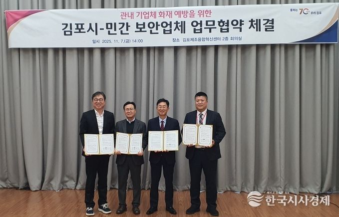 한국시사경제 경기북부취재본부 | 김포시가 지난 11월 7일 민간 보안업체 3개사와 ‘관내 기업체 화재 예방을 위한 민관 협력 업무협약(MOU)’을 체결했다. 이번 협약식은 최근 소규모 공장과 상가에서 발생한 화재가 초기 대응 지연으로 인해 큰 피해로 이어지는 사례가 늘어남에 따라 민간의 기술력과 공공의 행정력을 결합해 화재로부터 안전한 산업환경을 조성하기 위해 마련됐다.