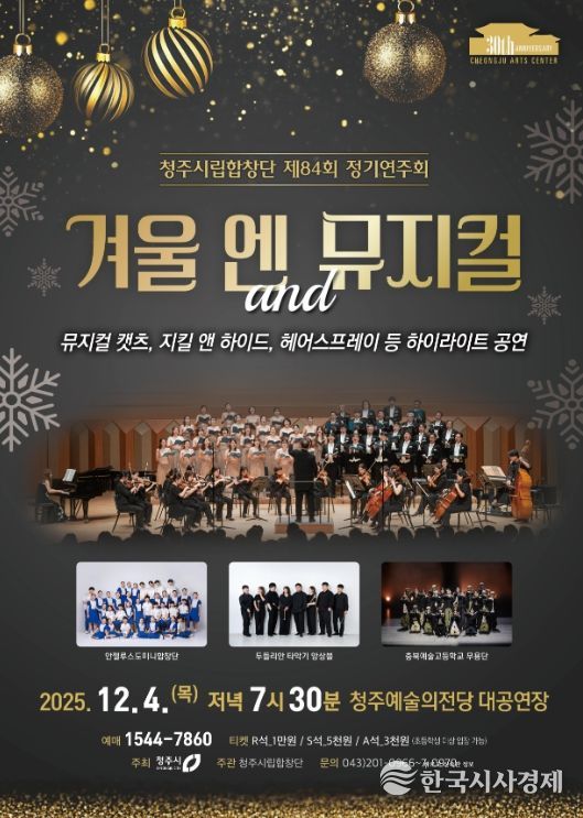 한국시사경제 오영주 기자 | 청주시립합창단(예술감독 겸 상임지휘자 이민영)은 12월 4일 오후 7시 30분 청주예술의전당 대공연장에서 제84회 정기연주회‘겨울 엔(and) 뮤지컬’을 선보인다.