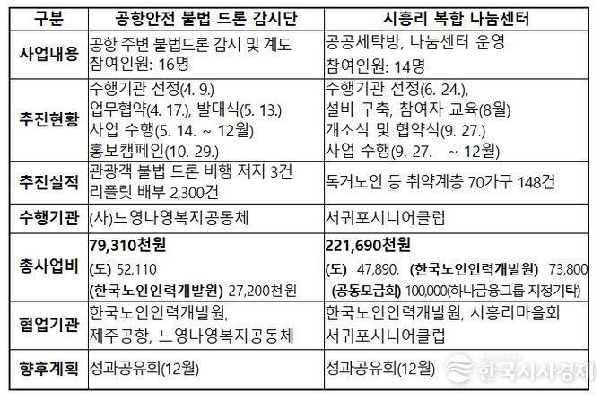 제주도는 일자리 수 확대와 함께 어르신 전문성과 지역 특성을 살린 특화사업 발굴에 주력하고 있다. 2023년부터 매년 자체 예산 1억 원을 투입해 한국노인인력개발원 제주지역본부와 협약을 맺고 신규 직무를 지속 개발 중이다.
