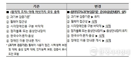 또한, 과학기술정보통신부의 검증기준을 준수한 기기 개발 및 보급 현황을 고려하고, 시각장애인 및 휠체어 사용 지체장애인 등 장애인 당사자의 실제 수요를 반영하여 예외적 접근성 개선 조치를 선택할 수 있는 대상을 소상공인 등으로 확대하고, 예외적 조치 내용을 일부 개선했다.