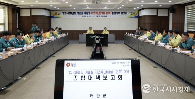 군은 지난 12일 군청 중회의실에서 부군수와 실국장, 관련 부서장, 읍면장, 기상청·유관기관 관계자 등 33명이 참석한 가운데 가세로 군수 주재로 ‘25~26년도 태안군 겨울철 자연재난(대설·한파) 종합대책 보고회’를 열고 대응계획을 점검했다고 밝혔다.