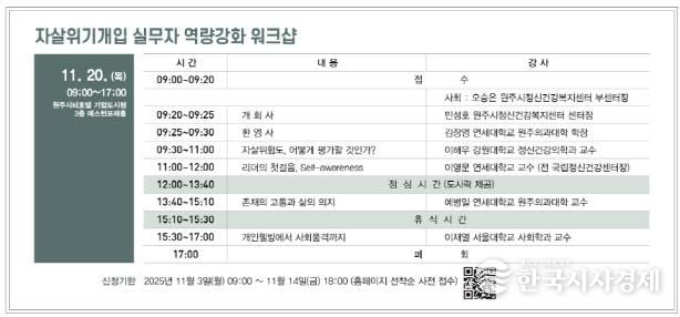 한국시사경제 권충언 기자 | 원주시자살예방센터는 오는 20일 원주시티호텔 기업도시점 애스턴포레홀에서 ‘자살위기개입 실무자 역량강화 워크숍’을 개최한다.