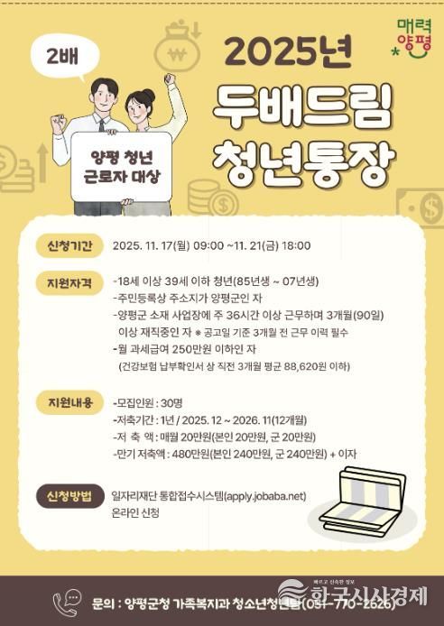 한국시사경제 기동취재팀 | 양평군은 청년들의 자립과 미래 설계 기반 마련을 위해 ‘두배드림 청년통장’ 사업을 추진한다고 밝혔다.
