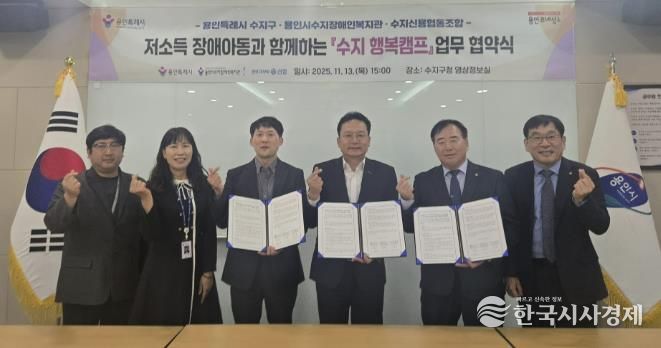 한국시사경제 사회팀 | 용인특례시 수지구는 13일 용인시수지장애인복지관과 수지신용협동조합과 함께 저소득 장애아동의 복지 향상과 장애 인식 개선을 위한 ‘수지 행복캠프’ 추진 업무협약을 체결했다고 14일 밝혔다.