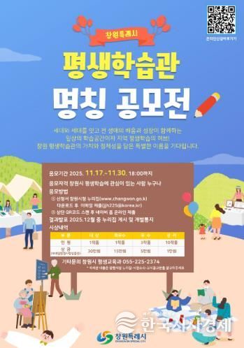 창원시 평생학습에 관심이 있는 사람이라면 누구나 참여할 수 있는 이번 공모는, 8자 이내의 명칭과 그에 따른 취지를 작성해 이메일로 제출하거나 QR코드를 통해 접수할 수 있다.
