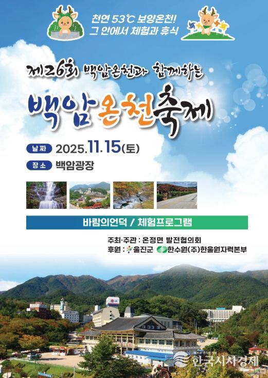 한국시사경제 권충언 기자 | 울진군은 11월 15일 울진군 온정면 백암광장 일원에서 ‘제26회 백암온천축제’를 개최한다.