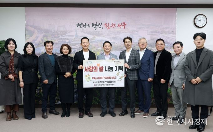 한국시사경제 대전취재본부 | 대전 서구는 14일 대전서구사랑협의회로부터 쌀 10kg 200포(총 2,000kg, 700만 원 상당)를 기탁받았다고 전했다.