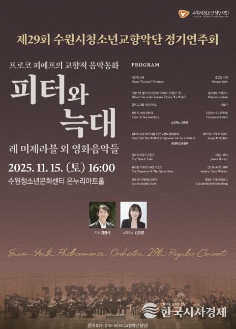 한국시사경제 사회팀 | 수원시청소년청년재단 수원청소년문화센터에서는 오는 11월 15일 오후4시, 온누리아트홀에서 제29회 정기연주회를 개최한다. 이번 연주회는 ‘프로코 피에프의 교향적 음악동화 '피터와 늑대'’를 중심으로, 세대를 아우르는 감동의 영화음악을 함께 선보이며 청소년 단원들의 풍성한 음악적 성장을 보여줄 예정이다.