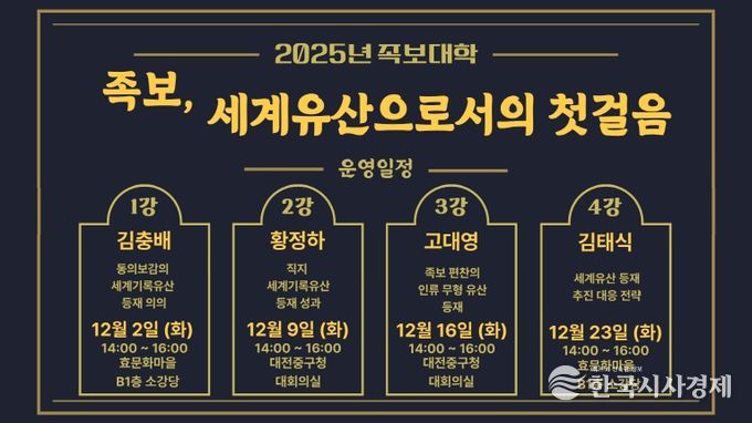 한국시사경제 대전취재본부 | 대전 중구는 오는 12월 2일부터 23일까지 매주 화요일, 총 4회에 걸쳐 2025 족보대학 ‘족보, 세계유산으로서의 첫 걸음’프로그램을 운영한다고 밝혔다.
