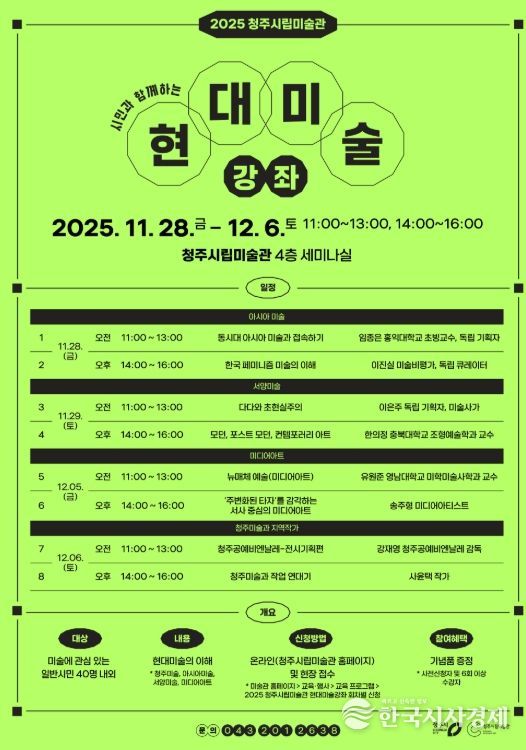 한국시사경제 오영주 기자 | 청주시립미술관은 오는 28일부터 12월 6일까지 현대미술을 폭넓게 이해할 수 있는 ‘시민과 함께하는 현대미술강좌’를 개최한다.