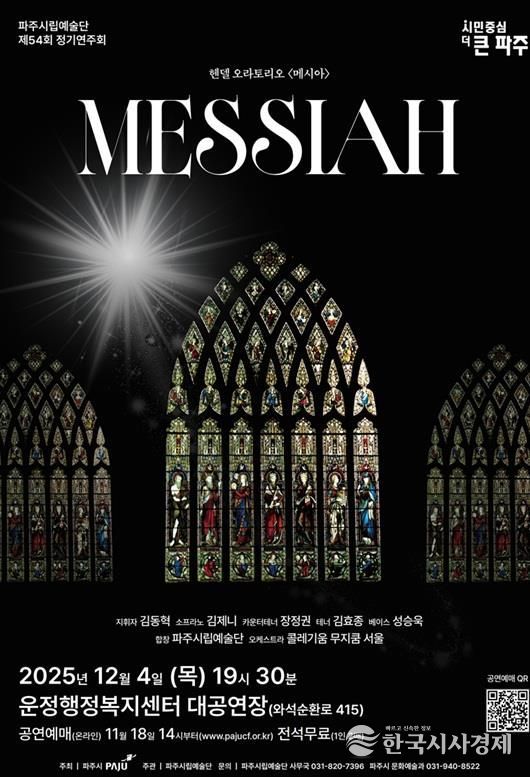 한국시사경제 문화팀 | 파주시는 오는 12월 4일 19시 30분, 운정행복센터 대공연장에서 시립예술단 제54회 정기연주회 ‘헨델 오라토리오 '메시아'’를 선보인다고 밝혔다.
