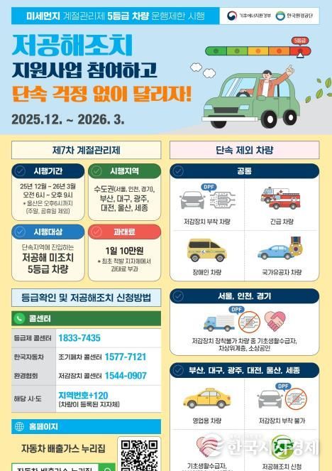 이번 제7차 계절관리제는 12월 1일부터 내년 3월 31일까지이며, 기간 내 배출가스 5등급 차량이 수도권(서울ˑ경기ˑ인천) 및 6대 특ˑ광역시(부산, 대구, 광주, 대전, 울산, 세종)에서 운행 중 단속에 걸리면 1일 10만 원의 과태료가 부과된다.