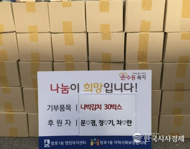 한국시사경제 사회팀 | 수원시 영통구 망포1동행정복지센터는 지난 17일, 망포1동 주민 3명이 저소득 취약계층을 위해 나박김치 30박스를 후원했다고 밝혔다.