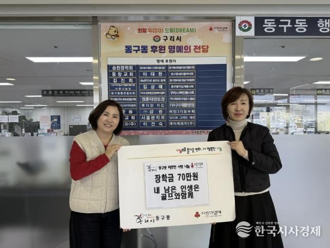 한국시사경제 경기북부취재본부 | 구리시 동구동 행정복지센터는 지난 18일 동구동 행정복지센터 대회의실에서 '내 남은 인생은 골프와 함께' 모임으로부터 관내 취약계층 청소년을 위한 장학금 70만 원을 기탁받았다고 밝혔다.