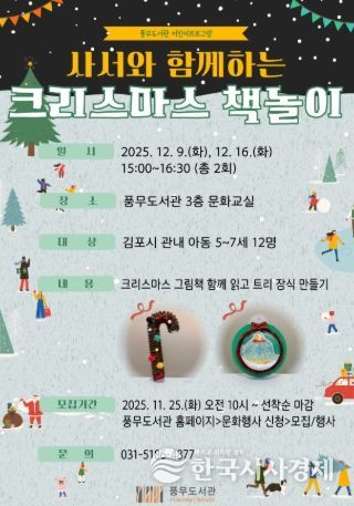 한국시사경제 윤광희 기자 | 김포시 풍무도서관은 ‘사서와 함께하는 크리스마스 책놀이’프로그램을 12월 9일과 16일 오후 3시부터 4시 30분까지 운영한다.