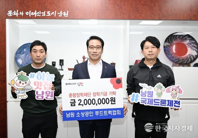 한국시사경제 전북취재본부 | 남원시는 지난 10월 16일부터 19일까지 나흘간 남원종합스포츠타운 일원에서 열린 '2025 남원국제드론제전 with 로봇'이 성황리에 막을 내린 가운데, 행사에 참여한 전국푸드트럭소상공인협회 소속 15개 업체가 드론제전에서 얻은 수익금의 일부인 총 200만원을 춘향장학재단에 기탁했다.
