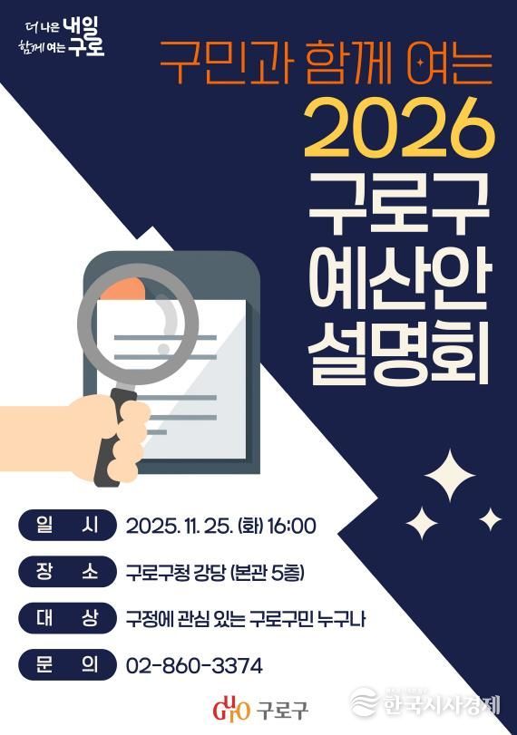 한국시사경제 기동취재팀 | 구로구가 11월 25일 오후 4시 구로구청 5층 강당에서 ‘구민과 함께 여는 2026년 구로구 예산안 설명회’를 연다.