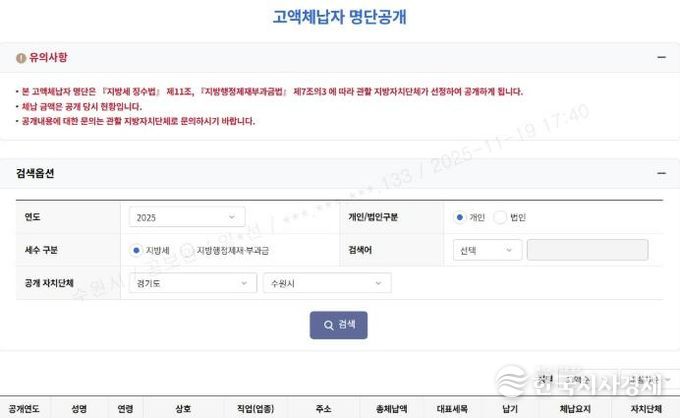 고액·상습체납자 명단은 수원시 홈페이지'분야별정보'세금'정보마당'‘고액 상습체납자 공개’ 게시판에서 확인할 수 있다.