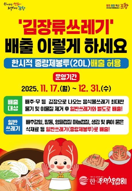 한국시사경제 문화팀 | 포항시는 김장철을 맞아 일시적으로 다량 배출되는 김장부산물 쓰레기를 원활히 처리하기 위해 ‘김장부산물쓰레기 특별 수거기간’을 운영한다고 밝혔다.