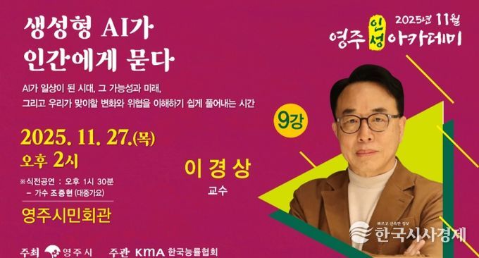 영주시는 오는 27일 오후 2시, 영주시민회관에서 KAIST 이경상 교수를 초청해 ‘11월 영주인성아카데미’를 개최다고 밝혔다.
