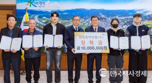 한국시사경제 노승선 기자 | 합천군은 참빛동아산업(주)(대표: 이해룡, 합천군 율곡면 소재)이 21일 합천군을 방문해 지역 학생들의 학업 지원을 위해 합천군 출신 5명의 대학생에게 각 200만원씩 총 1,000만원 규모의 장학금을 전달했다고 밝혔다.
