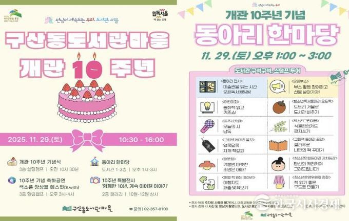 이순임 구산동도서관마을 관장은 “구민들의 서명운동으로 시작해 주민참여와 민·관 협치를 통해 탄생한 도서관이 어느덧 주민과 함께 성장한 10년이 됐다”며, “주민과 함께하는 이번 기념행사를 통해 앞으로의 10년도 구민들과 함께 그려가겠다”고 전했다.