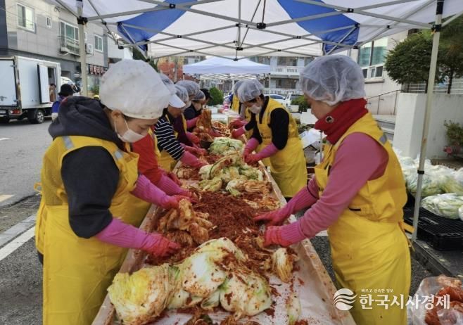 한국시사경제 사회팀 | 수원 징검다리봉사단은 지난 23일 수원시 장안구 정자2동 행정복지센터 주차장에서 사랑의 김장 담그기 행사를 진행했다.
