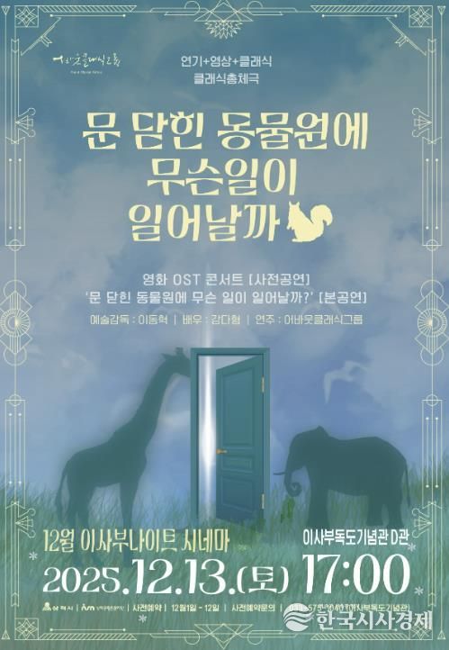 ‘2025 12월 이사부 나이트 시네마’는 12월 13일 17시에 이사부독도기념관에서 개최되며, 어린이와 가족 관람객을 위한 융합형 음악극을 선보일 예정이다. 예술단체 ‘어바웃클래식그룹’의 작품으로, “문 닫힌 동물원에 무슨 일이 일어날까?”라는 주제로 영화 OST 콘서트와 클래식·영상·연극을 결합한 클래식 총체극 형태로 진행된다. 프랑스 낭만주의 작곡가 카미유 생상스의 ‘동물의 사육제’를 원작으로 했으며, 풍부한 상상력과 감성을 자극하는 연출을 통해 한 편의 영화 같은 무대를 제공할 수 있도록 기획됐다.