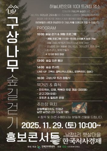 한국시사경제 이정이 기자 | 인제군마케팅센터는 오는 11월 29일 남면 남전리 일원에서 ‘구상나무 숲길 걷기 홍보 콘서트’를 개최한다. 이번 행사는 남전리 지역에 새롭게 개방된 약 6,500그루 규모의 구상나무 숲길을 주민과 관광객에게 소개하고, 구상나무 보전 가치를 널리 알리기 위해 마련됐다.