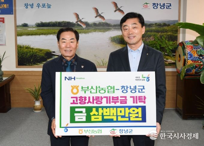 한국시사경제 노승선 기자 | 창녕군은 지난 26일 부산농협 임직원들이 자발적으로 모금한 고향사랑기부금 3백만 원을 전달받았다고 밝혔다. 이날 기탁식에는 농협중앙회 이수철 부산본부장, 김정화 부본부장, 신우경 창녕군지부장이 참석했다.