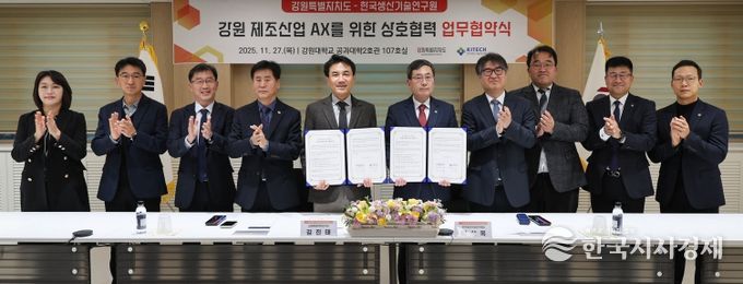 한국시사경제 경제팀 | 강원특별자치도는 11월 27일 오후 3시, 강원 제조산업의 AX(AI Transformation, 인공지능 전환)를 위한 상호 협력을 강화하기 위해 한국생산기술연구원(원장 이상목)과 업무협약(MOU)을 체결했다.