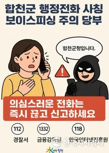 한국시사경제 노승선 기자 | 합천군은 최근 군청 행정전화가 사칭되는 보이스피싱 사례가 발생함에 따라, 보이스피싱을 예방하기 위하여 군민들에게 각별한 주의가 필요하다고 밝혔다.