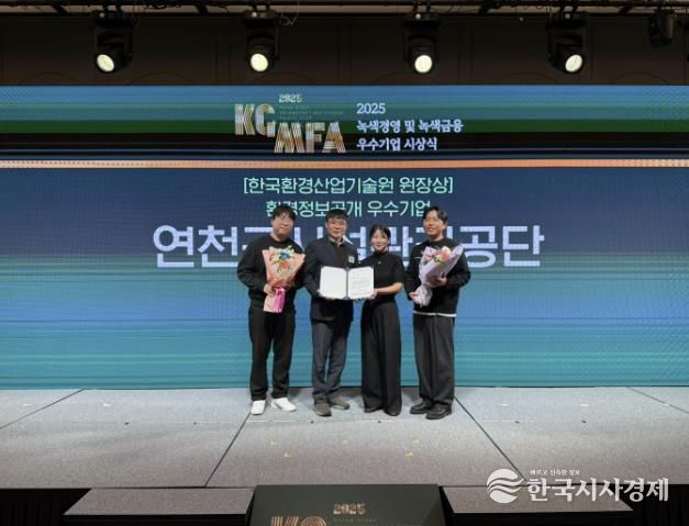 한국시사경제 경기북부취재본부 | 연천군시설관리공단은 지난 27일, ‘2025년 녹색경영 및 녹색금융 우수기업 시상식’에서 환경정보공개 부문 전국 공사·공단 중 유일하게 우수기관으로 선정되어 기술원장상을 수상했다고 밝혔다.
