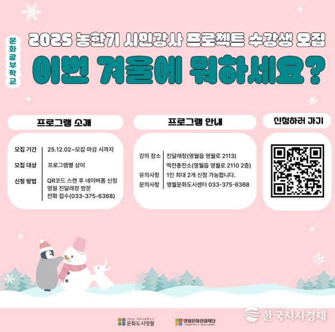한국시사경제 권충언 기자 | (재)영월문화관광재단은 2025 문화 광부학교 농한기 시민 강사 프로젝트 수강생을 12월 2일부터 모집한다고 밝혔다.