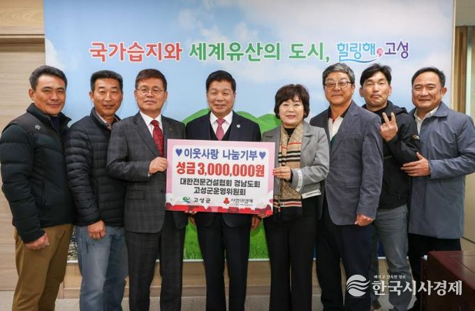 한국시사경제 윤광희 기자 | 고성군은 대한전문건설협회 경남도회 고성군운영위원회가 12월 2일, 고성군청을 방문하여 어려운 이웃을 위해 성금 300만 원을 전달했다고 밝혔다.