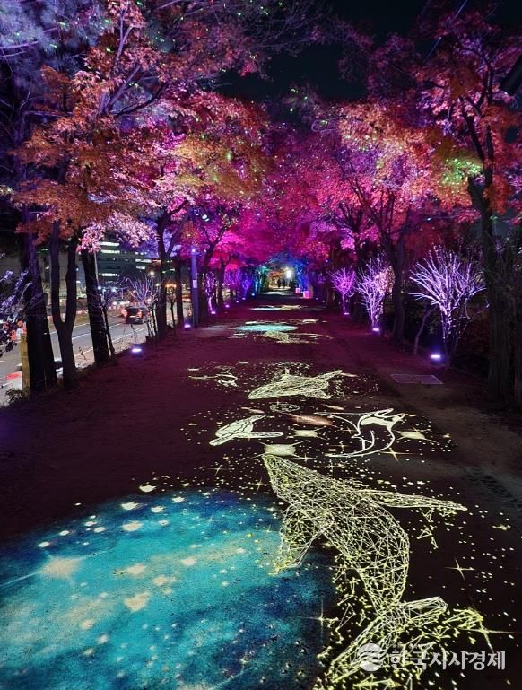 설치된 조명은 △가을 단풍잎이 흩날리는 ‘단풍길’ △연잎 위를 걷는 듯한 ‘물 위를 걷다’ △화사한 개나리가 수놓인 ‘개나리 꽃길’ △푸른 물결 속 고래가 유영하는 ‘밤하늘을 유영하는 고래’ 등 총 4가지 주제(테마)로 꾸며져 다양한 분위기를 즐길 수 있다.