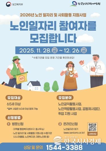 한국시사경제 이정이 기자 | 의성군은 지역 어르신들의 건강한 노후생활과 안정적 소득 활동을 지원하기 위해 12월 9일부터 16일까지 '2026년 노인일자리사업'참여자 2,706명을 모집한다고 밝혔다.