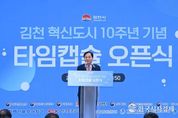 한국시사경제 권충언 기자 | 김천시가 혁신도시 준공 10주년을 맞아 율곡동 일원에서 추진한 ‘타임캡슐 개봉행사’와 ‘K-INNO 페스타’가 지난 10월 15일 시민들의 뜨거운 호응 속에 성황리에 마무리됐다. 이번 행사는 혁신도시 조성 10주년을 기념하는 동시에, 이전 공공기관 간의 소통과 화합을 통해 새로운 도약을 다짐하는 의미 있는 자리로 마련됐다. 특히 ‘타임캡슐 행사’와 ‘K-INNO 페스타’가 같은 날 함께 진행되며 그 의미를 더했다. 2016년 혁신도시 준공을 기념해 매설했던 타임캡슐을 개봉하는 행사에서는 김천시와 혁신도시로 이전한 12개 공공기관의 상징물과 기록물들을 보며, 지난 10년간의 변화와 발전을 되돌아보는 특별한 시간이 됐다. 현장을 찾은 한 기관 관계자는 “이런 물품들이 타임캡슐에 담겨 있었는지 몰랐는데, 직접 보니 감회가 새롭다.”라며, “다음 타임캡슐이 개봉될 때쯤엔 지금보다 더 발전한 혁신도시가 되기를 바란다.”라고 소감을 전했다. 타임캡슐 행사가 마무리된 뒤에는 본격적인 시민 참여 프로그램이 이어졌다. 한국전력기술 앞마당에서는 지역 농가와 소상공인들이 참여한 직거래 장터
