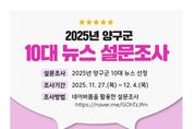 한국시사경제 권충언 기자 | 양구군이 올 한 해 최대 관심과 공감을 받은 ‘올해의 10대 뉴스’를 선정하기 위해 오는 4일까지 주민 설문조사를 실시한다. ‘올해의 10대 뉴스’ 선정은 군민의 목소리를 정책 수립에 반영해 군민이 체감할 수 있는 군정을 운영하고 올 한 해를 함께 돌아보며 공감 행정을 실현하기 위해 추진된다. 양구군은 올해 언론에 집중적으로 보도되거나 우수사례로 다수 소개된 사업, 주요 역점사업, 특수 시책 사업 등 관심과 공감을 받은 뉴스를 종합적으로 고려해 총 22개 사업을 후보 뉴스로 선정했다. 후보로 선정된 주요 사업은 △동서고속화철도 제4공구(용하리~야촌리) 토공구간 교량화 추진 △규제혁신 우수기관, 적극행정 우수기관 등 우수한 성과 창출 △KBS 전국노래자랑 10년 만에 성황리 개최 △3대 축제 모두 역대 최다 방문객 기록 △올해 인스타그램 조회수 120만 달성 등이다. 설문조사는 온라인‧오프라인으로 진행되며, 온라인 조사는 양구군 누리집 양구뉴스와 연결된 네이버폼을 통해 참여할 수 있다. 22개 후보 뉴스 중에 최대 5개까지 선택할 수 있다. 김지희 기획예산실장